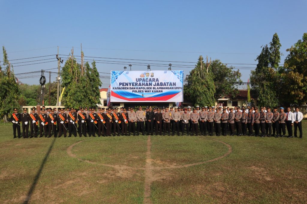 Upacara penyerahan Jabatan Kabag Ren AKP (Purn) Burhannuddin dan Kapolsek Blambangan Umpu Kompol (Purn) Catur Hendro Sutejo, dihadiri oleh Ketua Bhayangkari Cabang Way Kanan Ny. Ratna Adanan, Wakapolres Way Kanan Kompol Iwan Setiawan, Pejabat Utama, para Kapolsek, anggota Polres Way Kanan dan jajaran, ibu Bhayangkari dan pengurus ranting.
