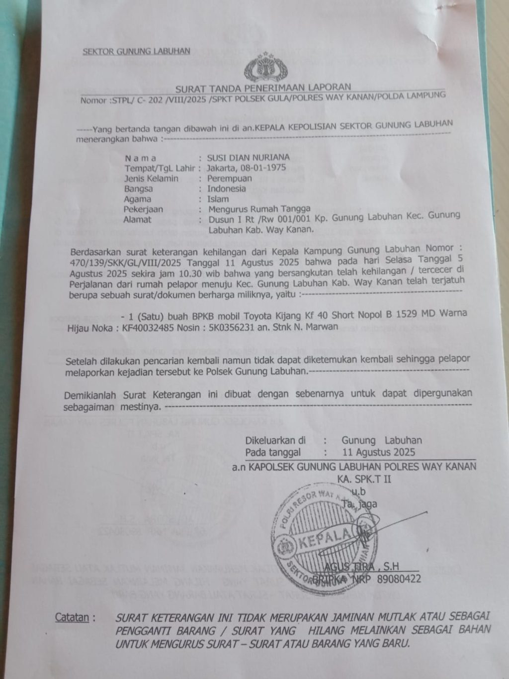 Way Kanan Telah Kehilangan BPKB Mobil Toyota Kijang Kf 40 Short Nopol B 1529 MD Warna Hijau, A.N stnk Marwan di Sekitaran Kec Gunung Labuhan Way Kanan 1 bulan ago Pemred About The Author Pemred See author's posts Post navigation Previous Menimipas: Jawara Beton Lapas Tangerang Siap Jadi IndustriNext Festival Nyeruit 2025 Meriah, Wulan Sari Dorong Generasi Muda Cintai Budaya Lampung
