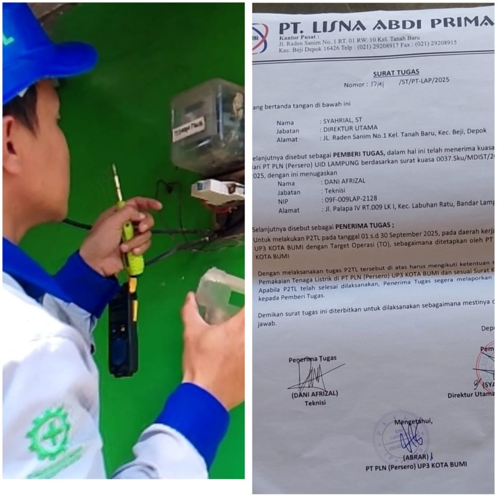 Dua orang petugas Penertiban Pemakaian Tenaga Listrik  (P2TL) dari PT Lisna Abdi prima yang diduga menyalahgunakan wewenang langsung tuju rumah konsumen didalam gang buntu yang beralokasi pengguna listrik Yang beralamatkan dijalan gotong royong kelurahan Tanjung aman kecamatan Kotabumi Selatan kabupaten Lampung Utara untuk bertujuan memeriksa instalasi PLN dan/atau instalasi pemakai tenaga listrik dari PLN (24-09-2025)