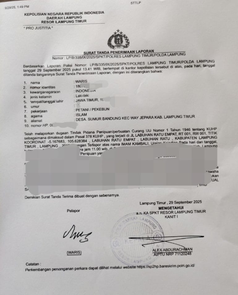 Kasus dugaan penipuan bermodus jual-beli tanah kembali mencuat di Kabupaten Lampung Timur. Seorang warga Desa Sumur Bandung, Kecamatan Way Jepara, bernama Waris (71) resmi melaporkan Imam Kambali, warga Desa Labuhan Ratu IV, Kecamatan Labuhan Ratu, ke Polres Lampung Timur. Laporan tersebut terdaftar dengan Nomor: LP/B/335/IX/2025/SPKT/Polres Lampung Timur/Polda Lampung pada Senin, 29 September 2025.