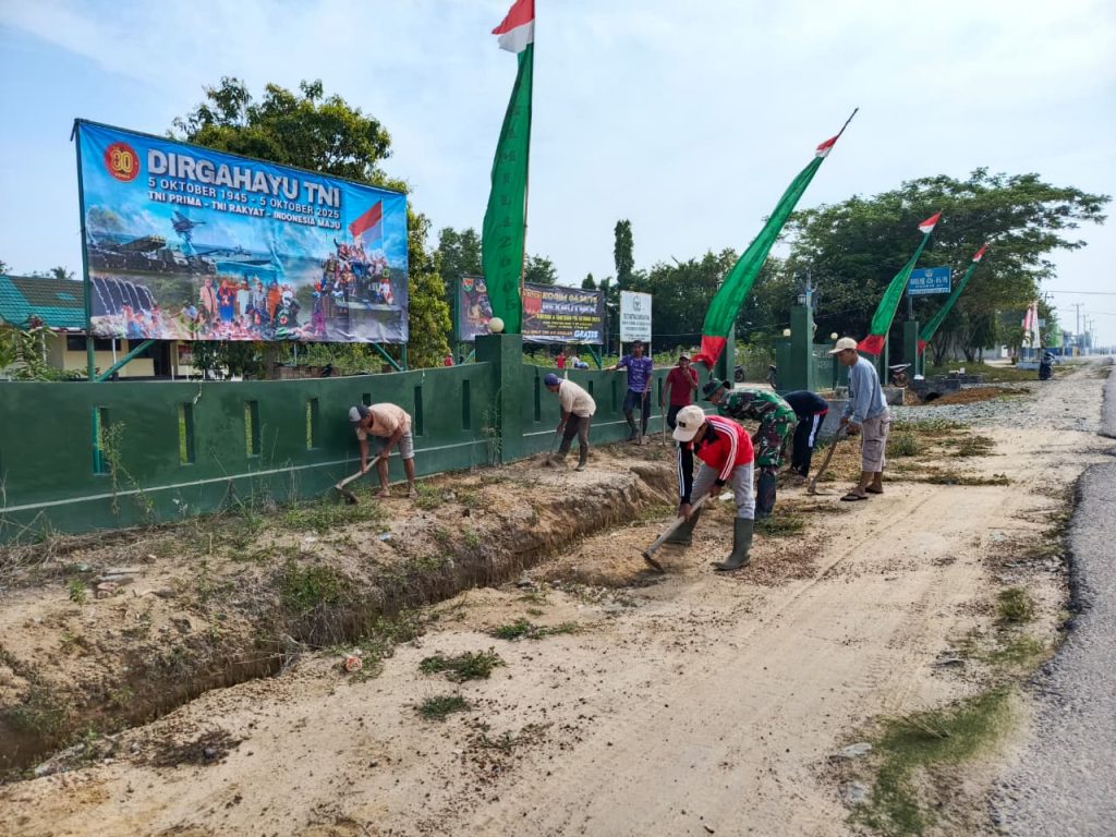 Penawar Aji (Tulang Bawang) — Danramil 426-05/PA, Kapten Inf Sutio, bersama anggota Koramil dan masyarakat setempat melaksanakan kegiatan gotong royong berupa pembersihan kiri kanan badan jalan serta pembangunan talud. Kegiatan ini berlangsung di depan Markas Koramil 426-05/PA, Jl. Dipati Panimbang, Desa Gedung Rejo Sakti, Kecamatan Penawar Aji, Kabupaten Tulang Bawang, pada Jumat, 10 Oktober 2025.
