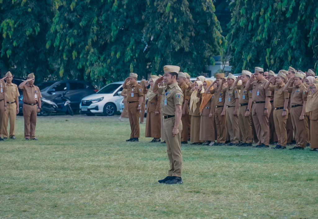 Gubernur Lampung yang diwakili Staf Ahli bidang Pemerintahan, Hukum dan Politik, Achmad Saefulloh memimpin apel mingguan di lingkungan Sekretariat Daerah Provinsi Lampung, di Lapangan Korpri, Senin (13/10/2025).