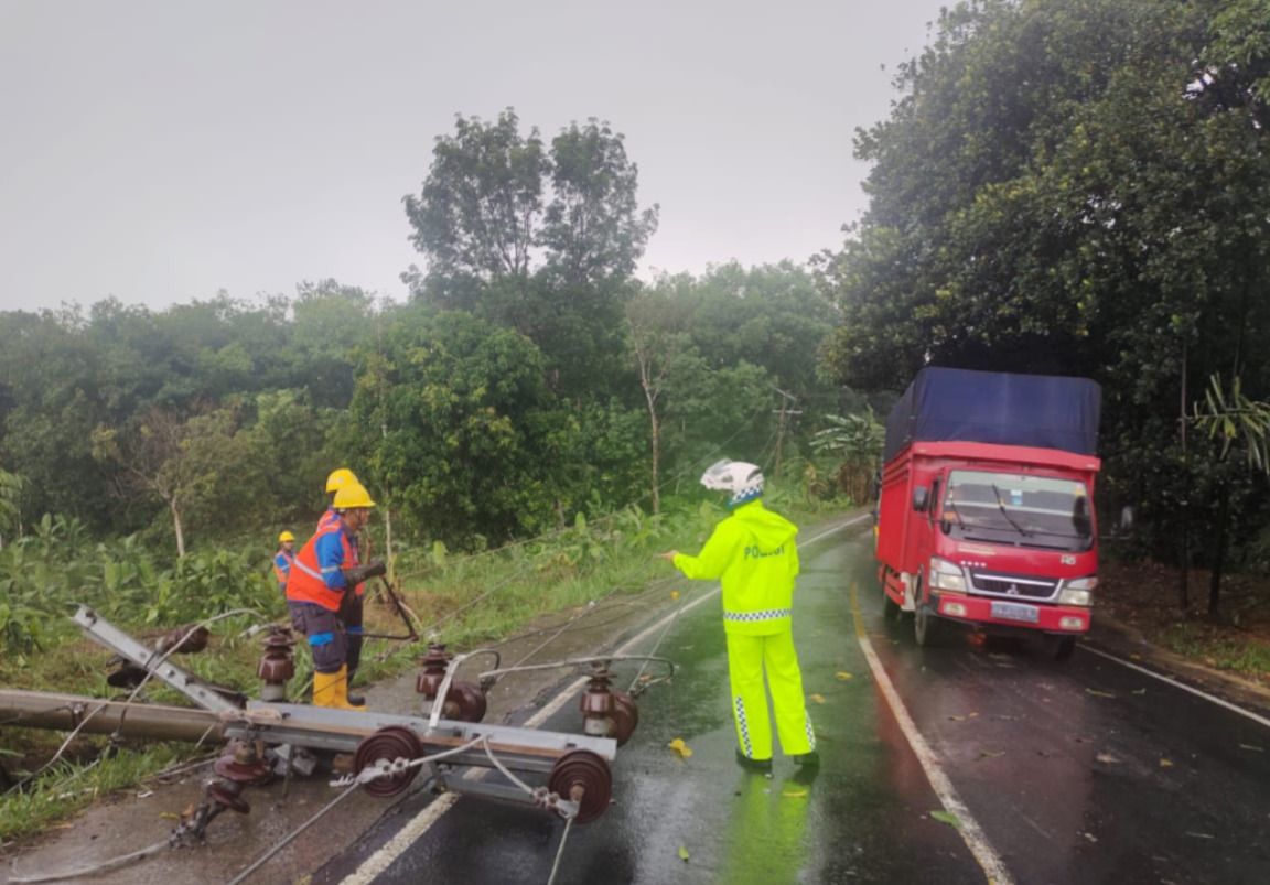 Way Kanan Aksi cepat tanggap dilakukan Satlantas Polres Way Kanan mengevakuasi tiang listrik milik perusahaan listrik negara (PLN) tumbang yang...