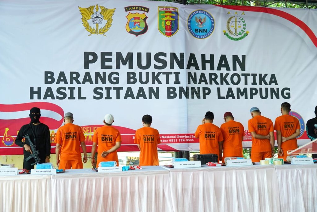Pemerintah Provinsi Lampung bersama BNNP Lampung melakukan pemusnahkan barang bukti narkotika sebanyak 11.324,99 gram sabu, 870 gram ganja, serta 14 butir ekstasi hasil sitaan BNNP Lampung, kegiatan dilaksanakan di halaman Komplek Perkantoran Gubernur Lampung, Selasa (18/11/2025).