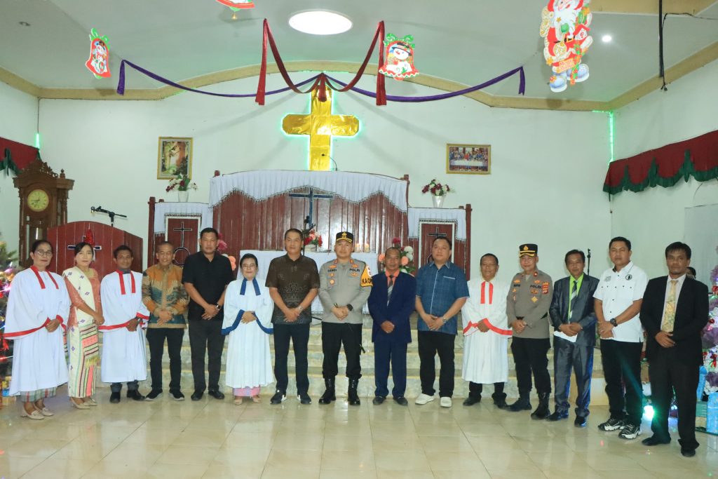 Upaya memastikan pelaksanaan ibadah Natal berjalan aman, lancar dan kondusif, Wakapolda Lampung Brigjen Pol Drs. Sumarto, M.Si melakukan pengecekan ke Gereja Huria Kristen Batak Protestan (HKBP) Tiyuh Pulung Kencana Kec. Tulang bawang Tengah dan Gereja Yohanes Paulus Tiyuh Murni Jaya Kec. Tumijajar Kabupaten Tulang Bawang Barat. Rabu (24/12/2025) Malam