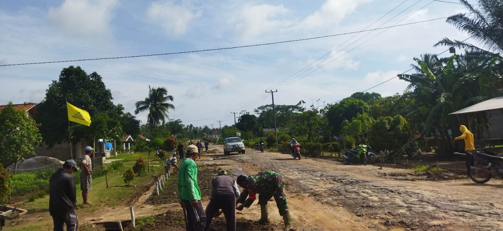 Menggala, Tulang Bawang — Babinsa Koramil 426-02 Menggala, Kodim 0426 Tulang Bawang, Sertu Saleh, bersama masyarakat melaksanakan kegiatan gotong royong pembersihan selokan dan parit di sepanjang ruas jalan Kampung Way Dente, Kecamatan Dente Teladas, Kabupaten Tulang Bawang, pada Jumat (27/03/2026).
