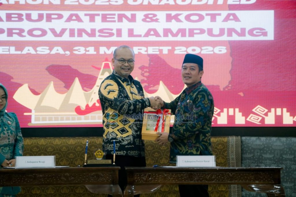 Bupati Pesisir Barat, Dedi Irawan, bersama kepala daerah kabupaten/kota se-Provinsi Lampung secara resmi menyerahkan Laporan Keuangan Pemerintah Daerah (LKPD) Unaudited Tahun Anggaran 2025 kepada Badan Pemeriksa Keuangan (BPK) Perwakilan Lampung, di Kantor BPK Perwakilan Lampung, Bandar Lampung, Selasa (31/3/2026).